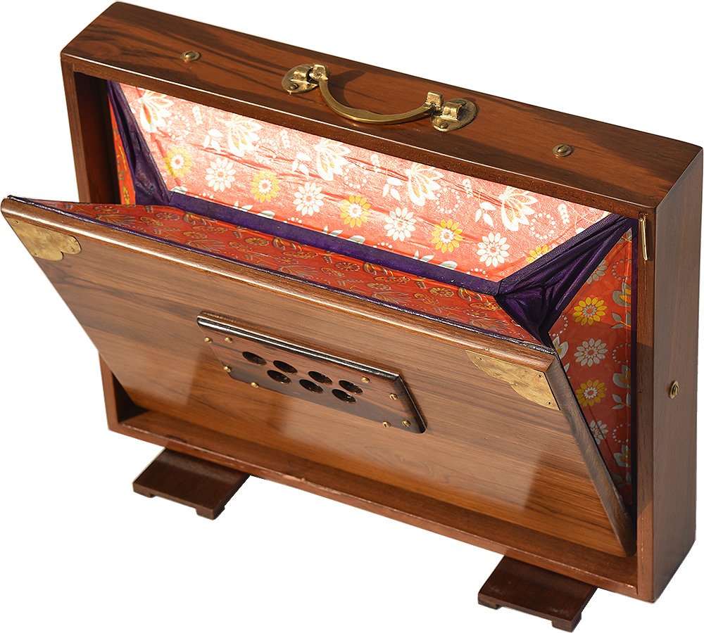 A Shruti box is a small wooden instrument that traditionally works on a system of bellows. It is similar to a harmonium and is used to provide a drone in a practice session or concert of Indian classical music. It is used as an accompaniment to other instruments and notably the flute. Use of the Shruti box has widened with the cross-cultural influences of world music and new age music to provide a drone for many other instruments as well as vocalists.